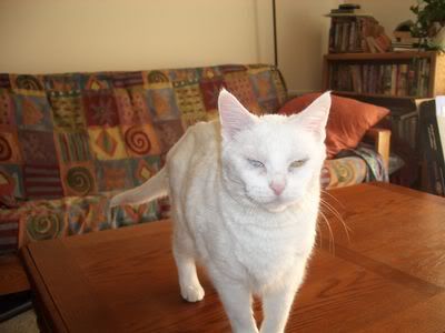 My cats share a nice three bedroom house and allow me to stay here for a small rental fee paid in cat chow, tuna, and cat litter. Their names I cannot pronounce in their tongue. So I use English nicknames. Samantha is a twelve year old Siamese. She is the queen ruler. Muffin is seven in human years, all white, a "mutt" who is very lean and atheletic. She can jump from a crouch on the ground to the roof in one bound. (I think she's from Krypton) The third is the youngest, biggest, sweetest, laziest, and loudest. I call him Sparticat. He's all black except for a white shield on his chest and four white "boots". They are really great companions and bed warmers. The expansion of the universe is driven by a need to get away from it all ... |