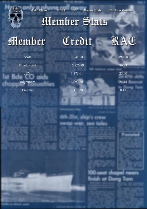 Knightmare, how's the website going??? Do you have anything on the web yet or no? Not just yet. We have the main page prepared and a couple of other things are ready to go. We are just waiting on getting web hosting service, which we will have as soon as I have a discussion with Mulder about which service we should go with. There are a couple of things we are looking for to be able to do all the things we want with the site. If all goes well, we should be up and running ( albeit constantly changing things ) within a week or two. :-) For now....I will show you what the site will look like.... This is the main page and this is most likely how the general layout will look Air Cold, the blade stops; from silent stone, Death is preordained Calm Chaos Forums : Everyone Welcome |