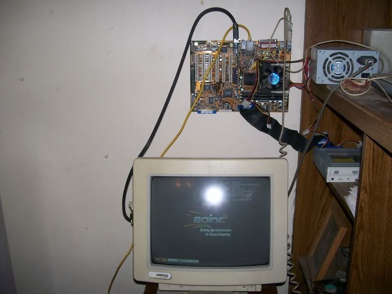 Where is all the dust !! ??? The pic of mine on the wall is a motherboard I broke trying to upgrade the CPU. I broke one of the CPU mounting brackets clean off and the board will no longer see a hard drive. Was going to throw it away and then saw the posts about BoincPE and since it did see the CDRom decided to give it a try. It has been running like this for a few months and has a RAC of 357, glad I kept it. Top left corner of CPU is a plastic tie strap holding on the CPU. Official Abuser of Boinc Buttons... And no good credit hound!