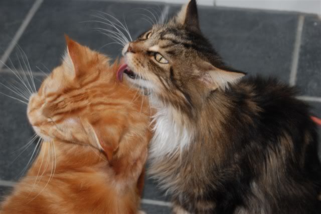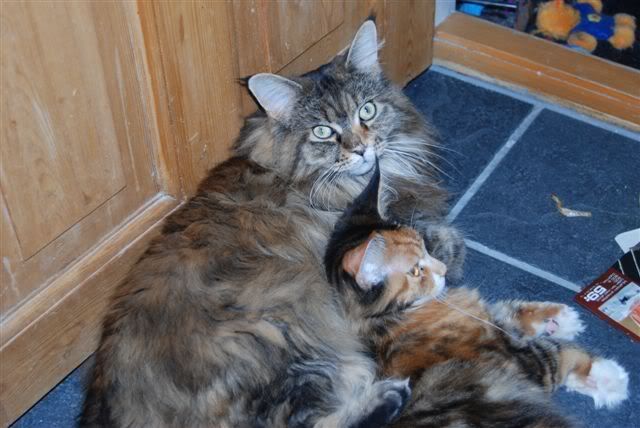 Oh yes, all four of my friends' kitties are Maine Coons. She has Lucky and Gimme. She also had Cool, but he died of heart failure, so she got Raffe instead, and his sister Rosa came with him. So yes, four Coons. Yes, Raffe's eczema has gone, he's fine again, the coat has grown back. I'll ask her for some recent pics of her kitties. Here are the ones I have: Lucky: Gimme snuggling with Rosa: Lucky grooms Raffe: "I'm trying to maintain a shred of dignity in this world." - Me