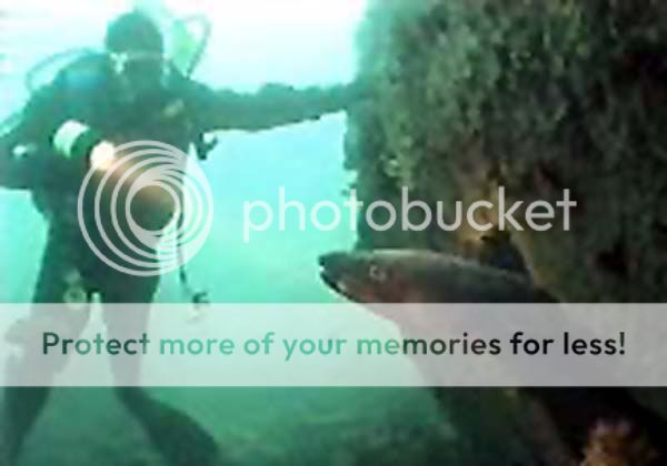 I will tell a story about a real monster, seen with my own eyes. I was a member of this diving club that went every two weeks to various spots on the West Coast of Scotland and North Coast of Ireland. Not enough for some of us, it had to be weekly sometimes twice weekly, we couldn't get enough. The loch we chose for our midweek nightdive was Loch Fyne. A sweet little dive called Anchor Spot. Darn hard to find on the dark single track road down the loch side, treacherous hairpins all the way. We quickly kitted up and plunged in as the last rays of the spring sun were but a memory in the sky.There were three of us, I was slightly in front and the other's were just behind about 10m, the visibility was great as there had been no rain for a week. I saw little wildlife of note on the way down, but at last I reached the rocky reef. I was still 15m above the bottom when a jewel caught my eye, it was a baby lobster beautifully camouflaged against the rock. A single diamond like jewel appearance in the mid section. It was barely longer than a pinky nail but amazingly beautiful. Suddenly a light danced around me, it was one of my buddies signaling from 5m above. Darn, oh well that's what computers are for, slowly I worked my way up. I was straddling a crevice about 1m wide. I looked over at one of my buddies and the look on the face and the hidden smile made me look down again, looming up from under me was an incredibly large conger. Battlescarred and looking kinda hungry. I decided it would be better to kneel beside our companion already in place. I hadn't noticed the crab in Rusty's hand at first. It was huge, I was already thinking about a dash of lemon perhaps when to my horror a crab big enough to feed 2 went flying down into the crevice, the conger lunged forward it's gaping maw open and wham the crab literally exploded in its jaws. Bits were drifting around us in the current. Sadly no camera. They say Congers when they reach maturity head off for the Madeira Islands to breed. I think this creature though decided Loch Fyne seafood too much to resist and stuck around for years. The smaller ones you can feed by hand but I don't think this character was a safe bet. To give you an idea I estimate the fellow I met was twice as big as the one you see in this pic.. Balveda ![]() ![]() ![]() |