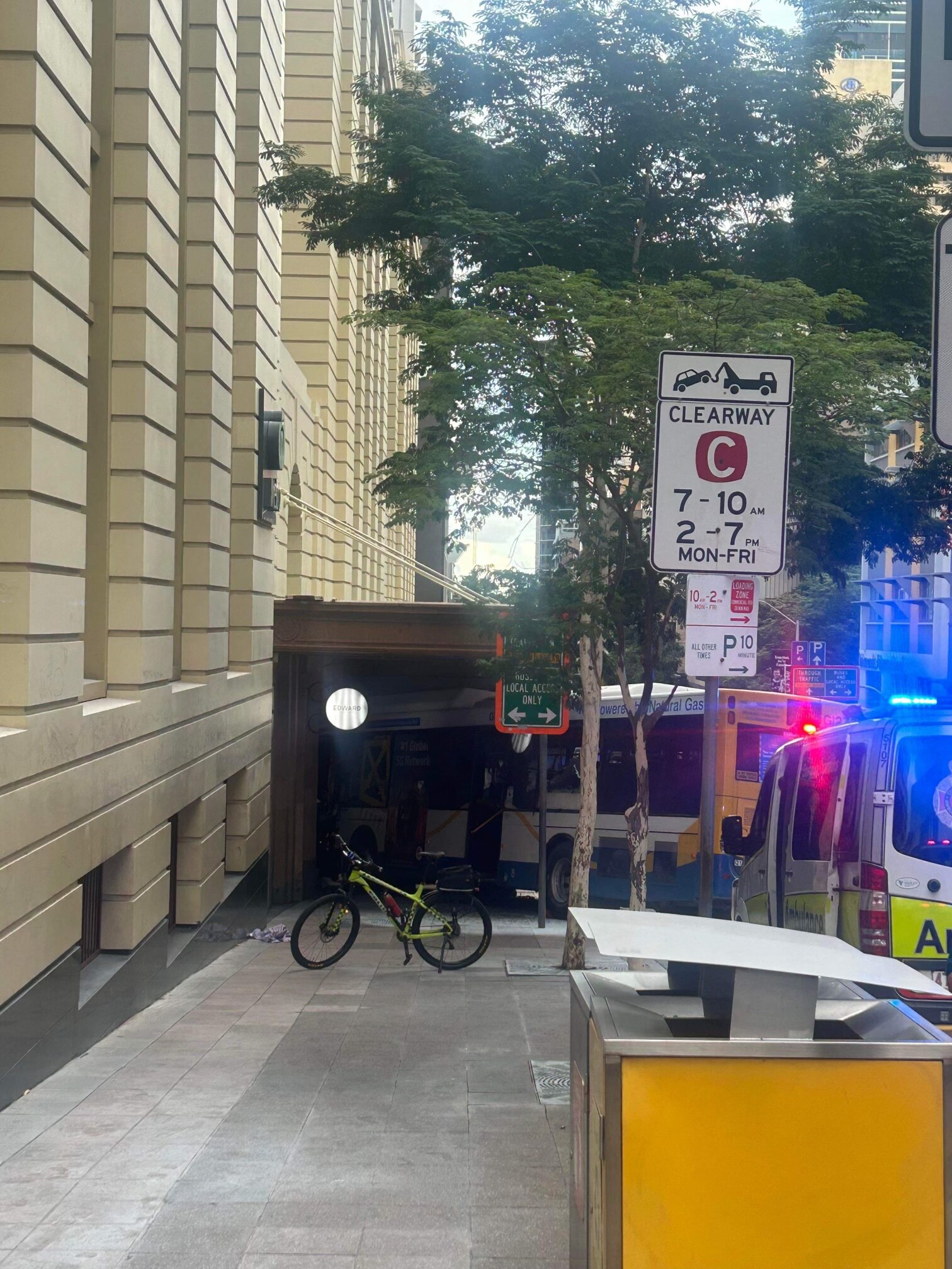 Now why did he lose control? Woman killed after being pinned between bus and building on Edward Street in Brisbane CBD. |