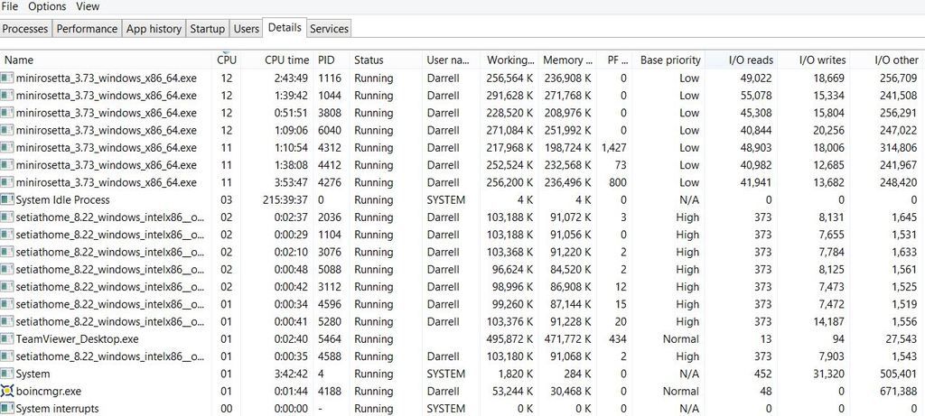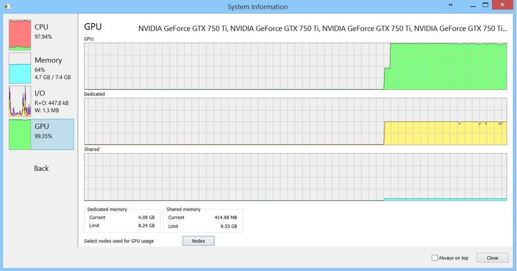 A bit of history for the newbies In a place not so long ago and not so far away, a project called the Search for ExtraTerrestrial Intelligence (SETI) was started. It processed data from the Arecibo radio telescope using CPUs only. The SETI application was slow, taking 196 hours on a 133Mhz PC. As CPUs got faster, SETI increased the amount of crunching each WU had to do. Later, the Berkeley Open Infrastructure for Network Computing (BOINC) was developed for SETI and made available to the world so other projects could also use networked computers easily in their crunching. GPUs were used for graphical processing and not data crunching in general. Then some very smart people developed the means to use GPUs to assist in the processing of data, and GPU applications were developed to make better use of those computers that had GPUs installed. This greatly speeded up the processing, allowing more work per WU to be done in less time, but a CPU was needed full-time to supply the GPU with data and receive the results. Volunteers got together to optimize the application code and algorithms thus further increasing the processing speed. Today, SETI has both CPU-only and GPU applications to process their data, and the applications are very optimized and tunable to some degree. This allows new users to immediately start crunching data with very little effort or knowledge. Other projects may also have both types of applications (CPU and GPU), or only a single type. For those people reading this, I suspect you are not the typical “install and run†type of person, and you want to get more from your computer(s). If this is not you, stop reading here. Also, if you do not have a reasonably recent GPU or chose not to use it for crunching SETI, there is no need to read further. Only for the advanced user (and wanna be's) with graphic card(s) The following is written from a Windows user perspective and BOINC Manager 7.6.33, but other systems have equivalent capabilities. I am going to assume here that you have not installed the application using an optimized package, you do not run GPU intensive games (or if you do, you know how to use the BOINC Manager -> Options -> Exclusive applications), and your CPU is mid-range or faster (e.g., Intel I5). To further increase the effectiveness of your computer(s), you are going to have to open the lid and make a few changes. By the way, effectiveness is doing something very well, which may or may not be efficient. This posting is primarily about effectiveness. A hydrogen bomb may be used to kill a house fly, but it is not efficient. The common fly swatter, while less effective, is much more efficient. The first thing to do is look in the folder where BOINC stores the project information. The usual location is “drive letter:\ProgramData\BOINC†If a file named “cc_config.xml†is not present, create it using Notepad or similar as: <cc_config> <log_flags> <unparsed_xml>1</unparsed_xml> </log_flags> <options> <process_priority_special>4</process_priority_special> </options> </cc_config> BE CAREFUL THAT THE FILETYPE IS “XML†EVEN THOUGH IT IS A TEXT FILE. This will help you debug any errors you might make later, and increases the priority of the SETI GPU application to “High priorityâ€. (more on priority later) If your GPU has at least 2Mb RAM, you can run two WUs per GPU. The following will cause this to happen and for SETI GPU application to run at “High†priority: in “drive letter: \ProgramData\BOINC\projects\setiathome.berkeley.edu†create a new or modify the file named “app_config.xml†with the following entries: <app_config> <app> <name>setiathome_v8</name> <gpu_versions> <gpu_usage>0.5</gpu_usage> <cpu_usage>0.125</cpu_usage> </gpu_versions> </app> </app_config> BE CAREFUL THAT THE FILETYPE IS “XML†EVEN THOUGH IT IS A TEXT FILE. This will cause two WUs per GPU to be run, and won’t tell the BOINC Manager to restrict CPU applications until 8 WUs are running on the GPU (more on CPU time later). For more on these parameters, see the BOINC wiki Client Configuration. In that same folder, there is a file named “mb_cmdline-8.22_windows_intel__opencl_nvidia_SoG.txtâ€. Edit this file using Notepad or similar, and enter data appropriate for YOUR GPU. You may need to search the forums to find one like you have, but here is the set I use: -use_sleep_ex 60 -sleep_quantum 2 -high_prec_timer -high_perf -tune 1 64 1 4 -tune 2 64 1 4 -period_iterations_num 5 -sbs 384 -spike_fft_thresh 4096 -oclfft_tune_gr 256 -oclfft_tune_lr 16 -oclfft_tune_wg 256 -oclfft_tune_ls 512 -oclfft_tune_bn 64 -oclfft_tune_cw 64 NOTE WELL: this is all on one line, and is appropriate for the GTX750Ti GPU. Use the BOINC Manager -> Options -> read config files to get them loaded. Check BOINC Manager -> tools -> event log to check for any errors, correct if needed and repeat. If you experience lag or missed characters when typing, increase period_iterations_num 5, perhaps to 10. The faster your GPU, the smaller this number can be, and vice versa. This will cause the SETI GPU application to release the CPU after a service is performed for the GPU. The default behavior without these parameters is to loop in the CPU (AKA “spin-loopâ€), testing for the GPU to complete the data processing of a small amount of data. This looping amounts to about 4 or more times the actual amount of time needed to support the GPU, and requires a CPU core to itself. Thus a single mid-CPU core WITH these parameters can support 4 WUs or more. Does this actually work? Yes. Look at the screen captures of one of my systems: BOINC Manager view This shows 8 SETI V8 WUs on the 4 GPUs while running 7 compute-intensive Rosetta WUs. This computer’s CPU is 4 core with hyper-threading clocked at 4.0Ghz and 4.4Ghz turbo. But are they really compute-intensive? Task Manager view Task Manager is showing 7 CPU compute-intensive tasks, 8 SETI V8 tasks, and still has 3% idle CPU But … how about the GPUs? Aren’t the