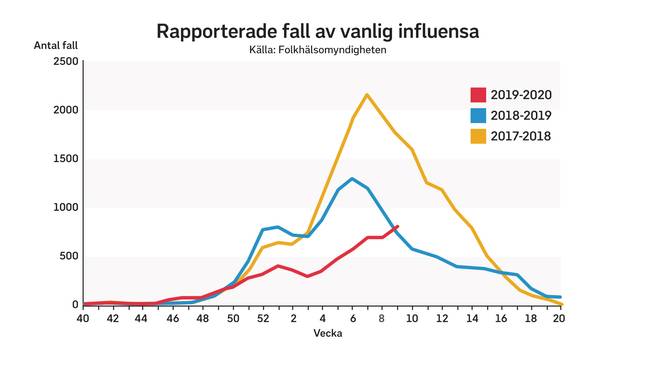 Meanwhile the cases of the seasonal flu is lower than it use to be. The worst outbreak in Sweden in the last five years was the winter of 2017/18 when more than 20,000 people were reported to be sick with regular flu with a peak in February and March. That season, 1012 people died of the disease, most of them elderly. So far this winter (week 44-03), 65 people have been registered as deceased in the seasonal flu in Sweden. The corona virus can have major effects on the world economy. Yesterday's stock market decline was the largest since the financial crisis in 2008. Reduced economic activity in the world can lead to a sharp economic downturn. |