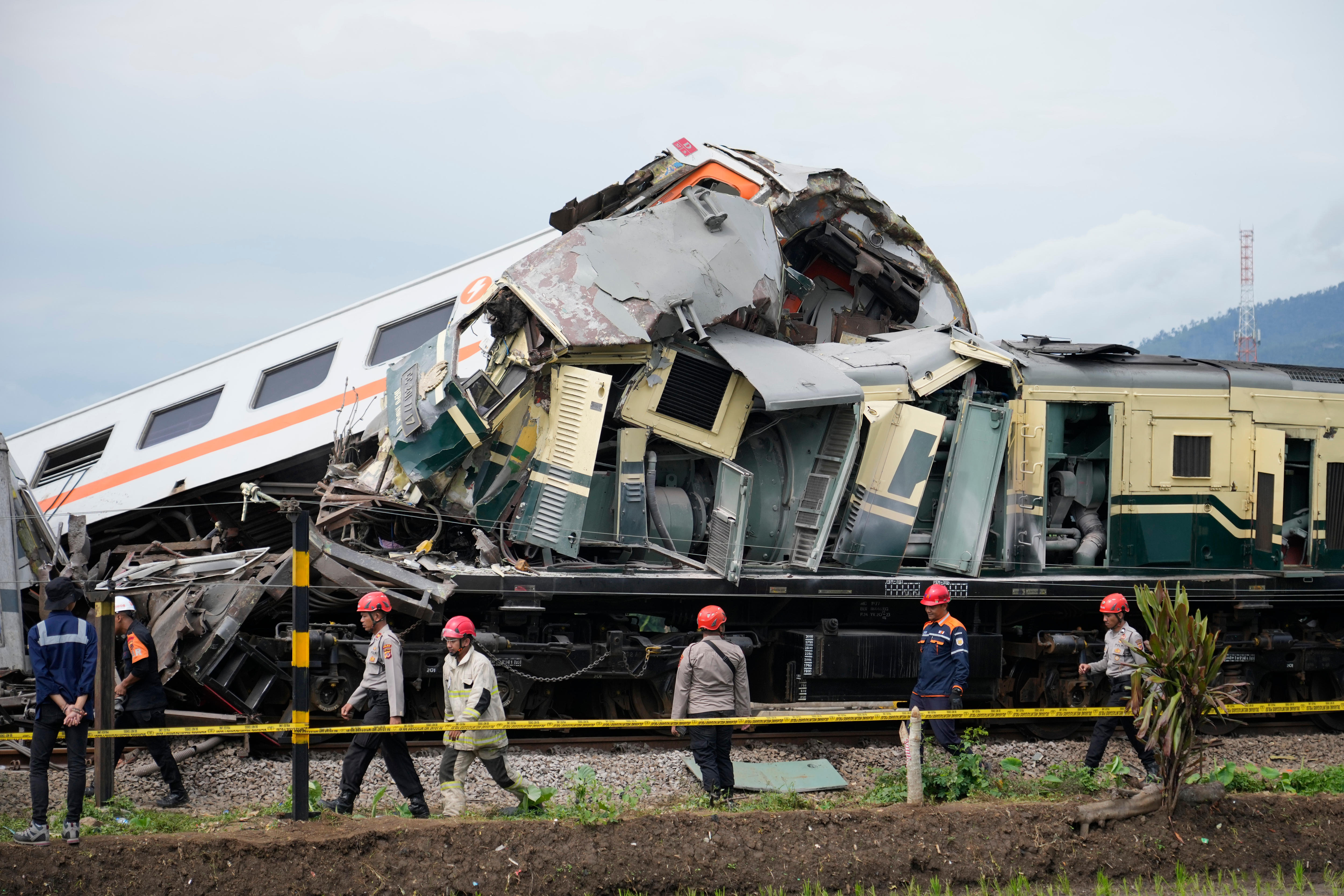 When trains meet. Two trains collide in Indonesia's West Java province, killing at least four people. Two trains have collided on Indonesia's main island of Java, causing carriages to buckle and overturn killing at least four people. |